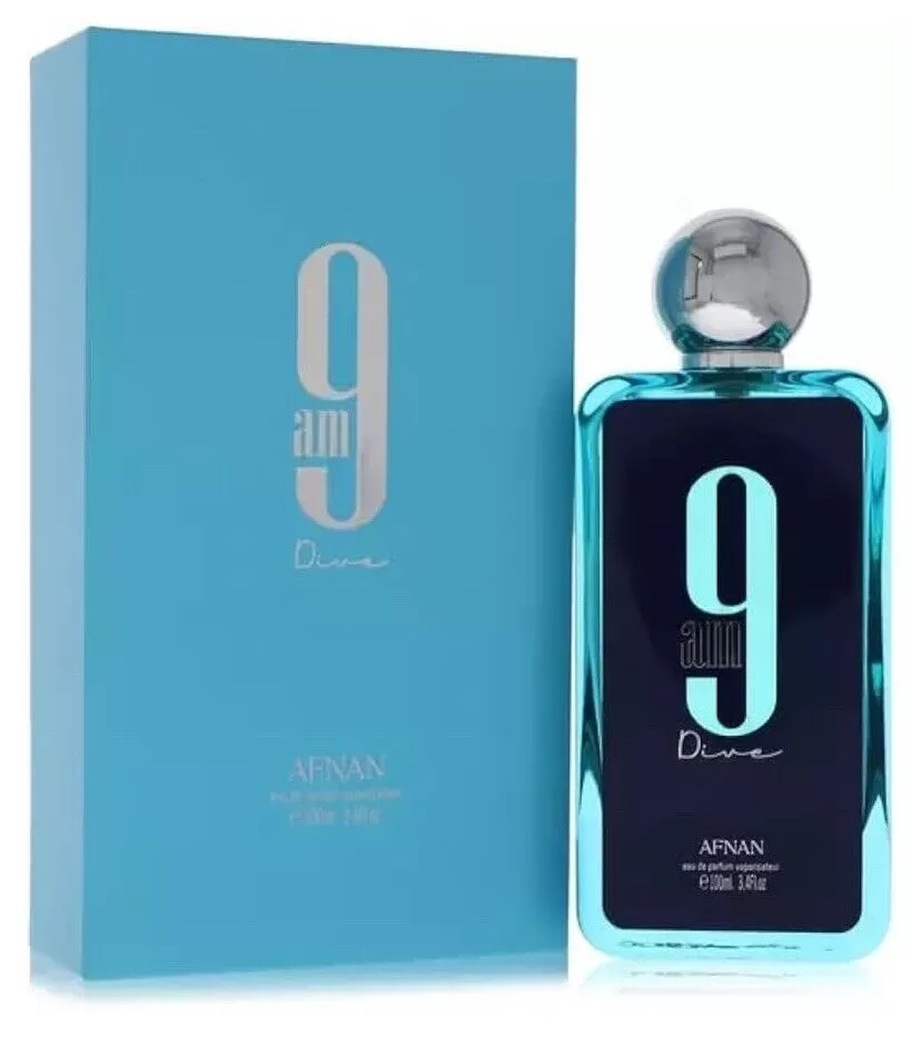 9am Dive de Afnan é um perfume Aromático Aquático Compartilhável. Esta é uma nova fragrância. 9am Dive foi lançada em 2022. As notas de topo são: Limão, Hortelã, Groselha Preta e Pimenta Rosa. As notas de coração são: Maçã, Cedro e Incenso. As notas de fundo são: Gengibre, Sândalo, Patchouli e Jasmim.