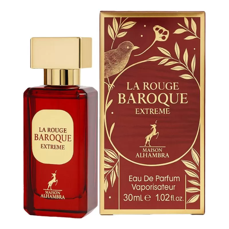 Baroque Rouge Extrait de Maison Alhambra é um perfume Aromático Especiado Compartilhável. Baroque Rouge Extrait foi lançada em 2022. As notas de topo são: Açafrão e Amêndoa. As notas de coração são: Notas Amadeiradas, Cedro e Jasmim Egípcio. As notas de fundo são: Notas Amadeiradas, Âmbar Cinzento e Almíscar.